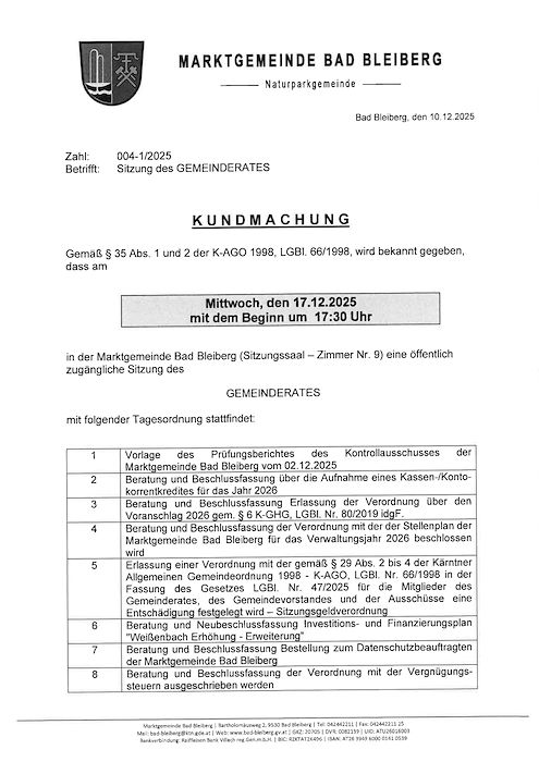 Kundmachung – Sitzung des Gemeinderates am 17.12.2025